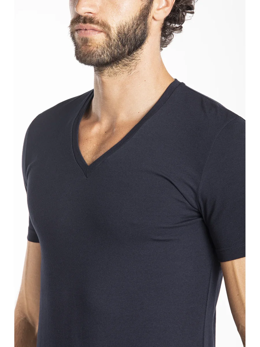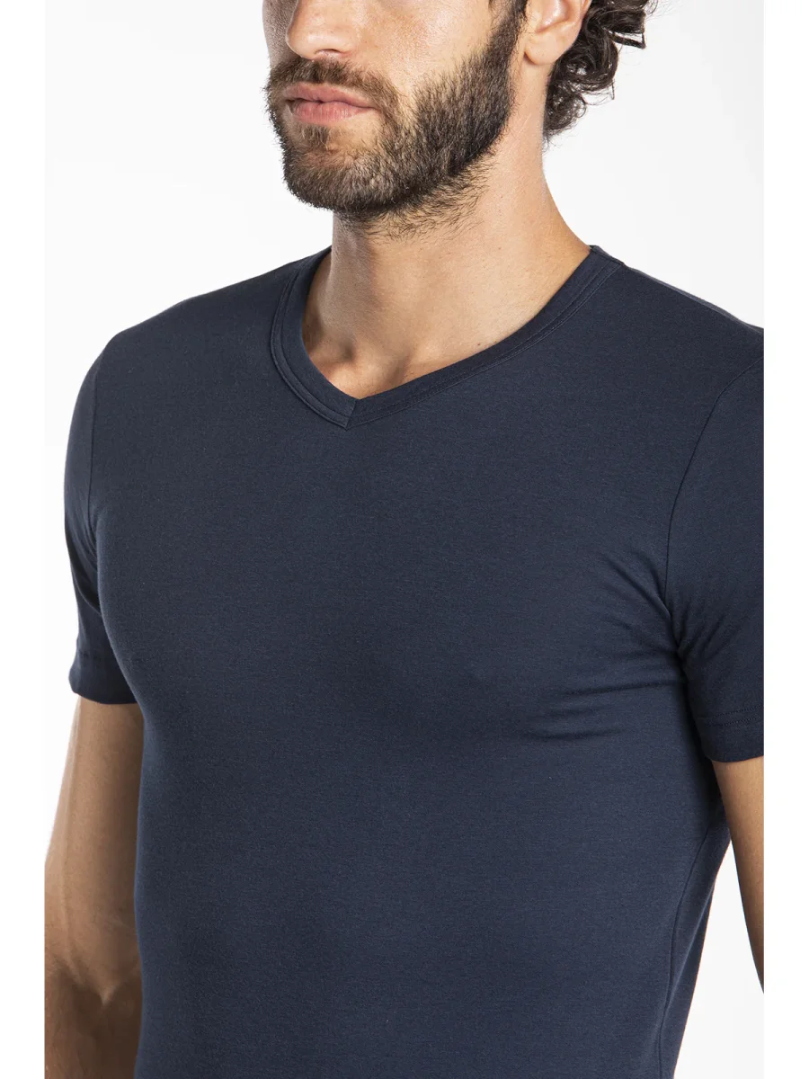 Maglietta blu collo a V in jersey di cotone elasticizzato taglio moderno e confortevole