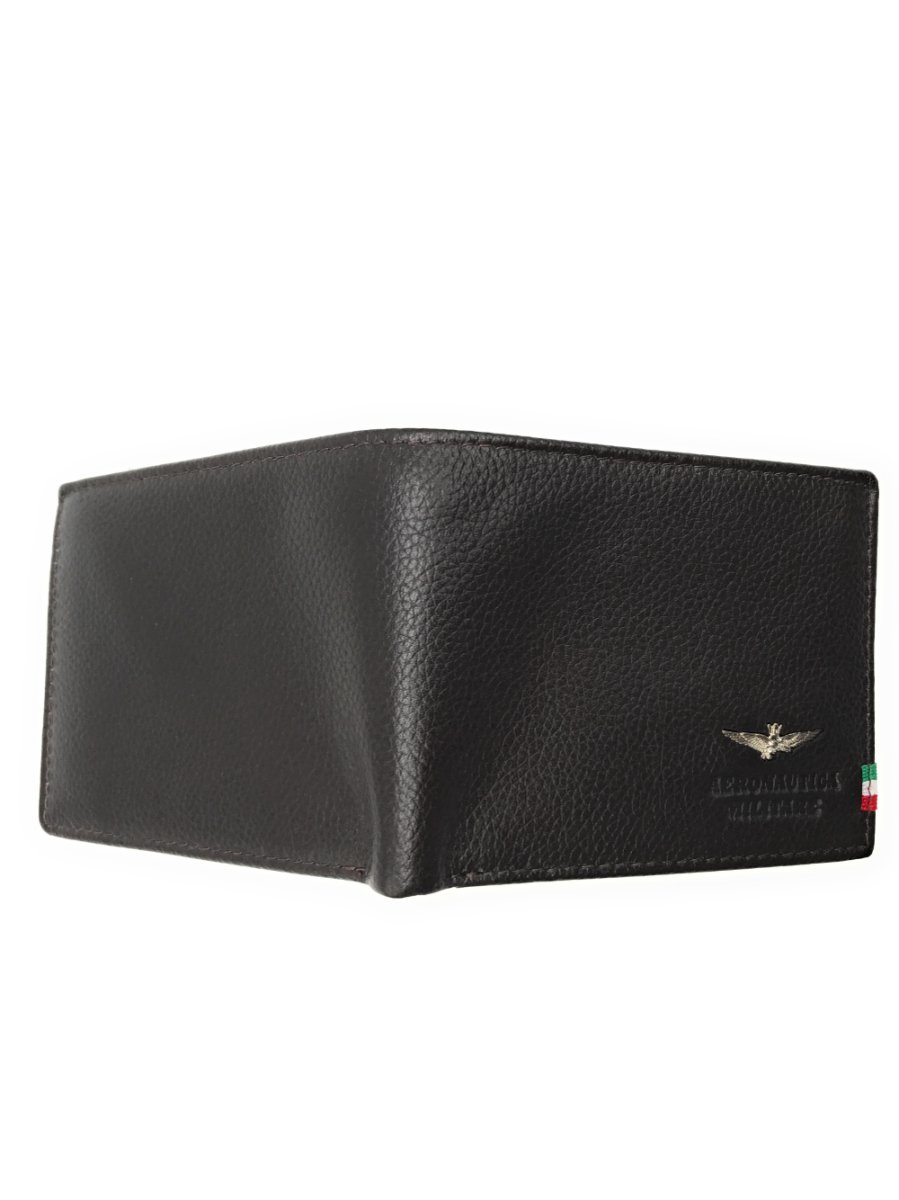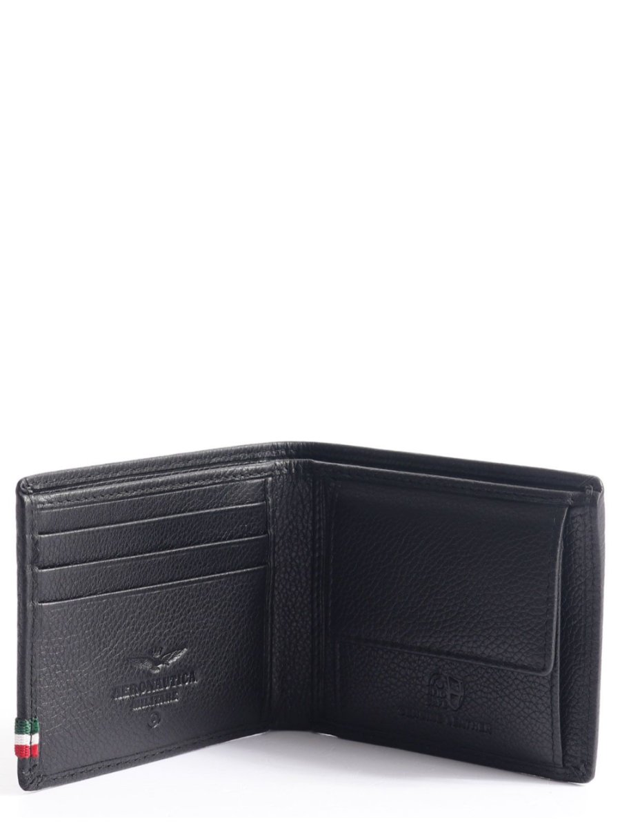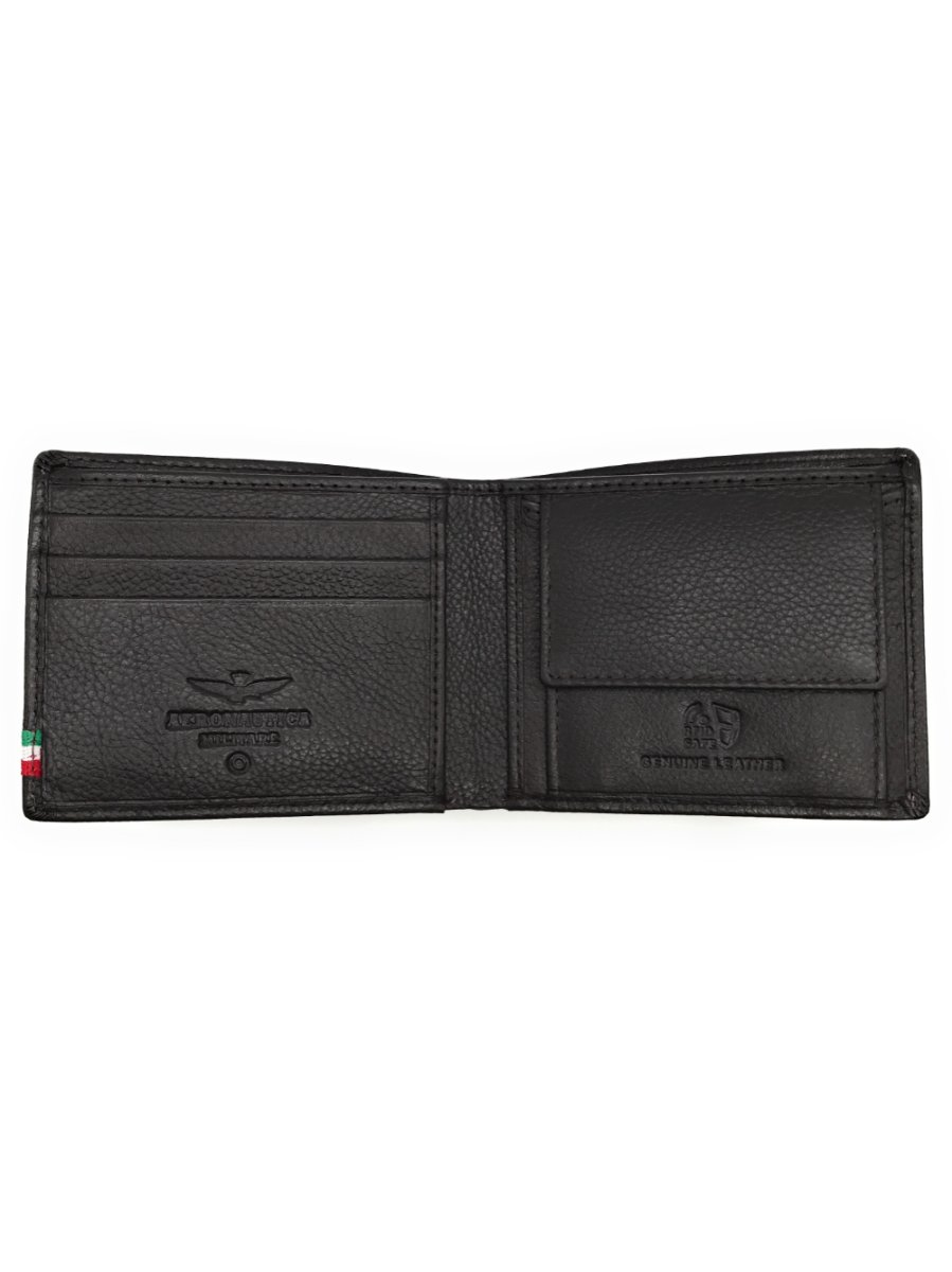 Portafoglio in pelle con scomparto per banconote, scomparti per carte di credito e vano per monete.