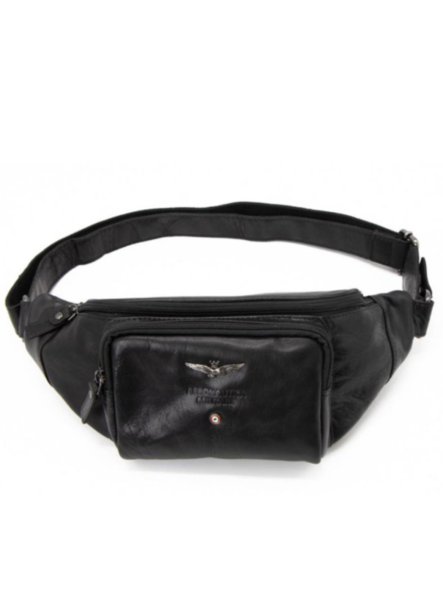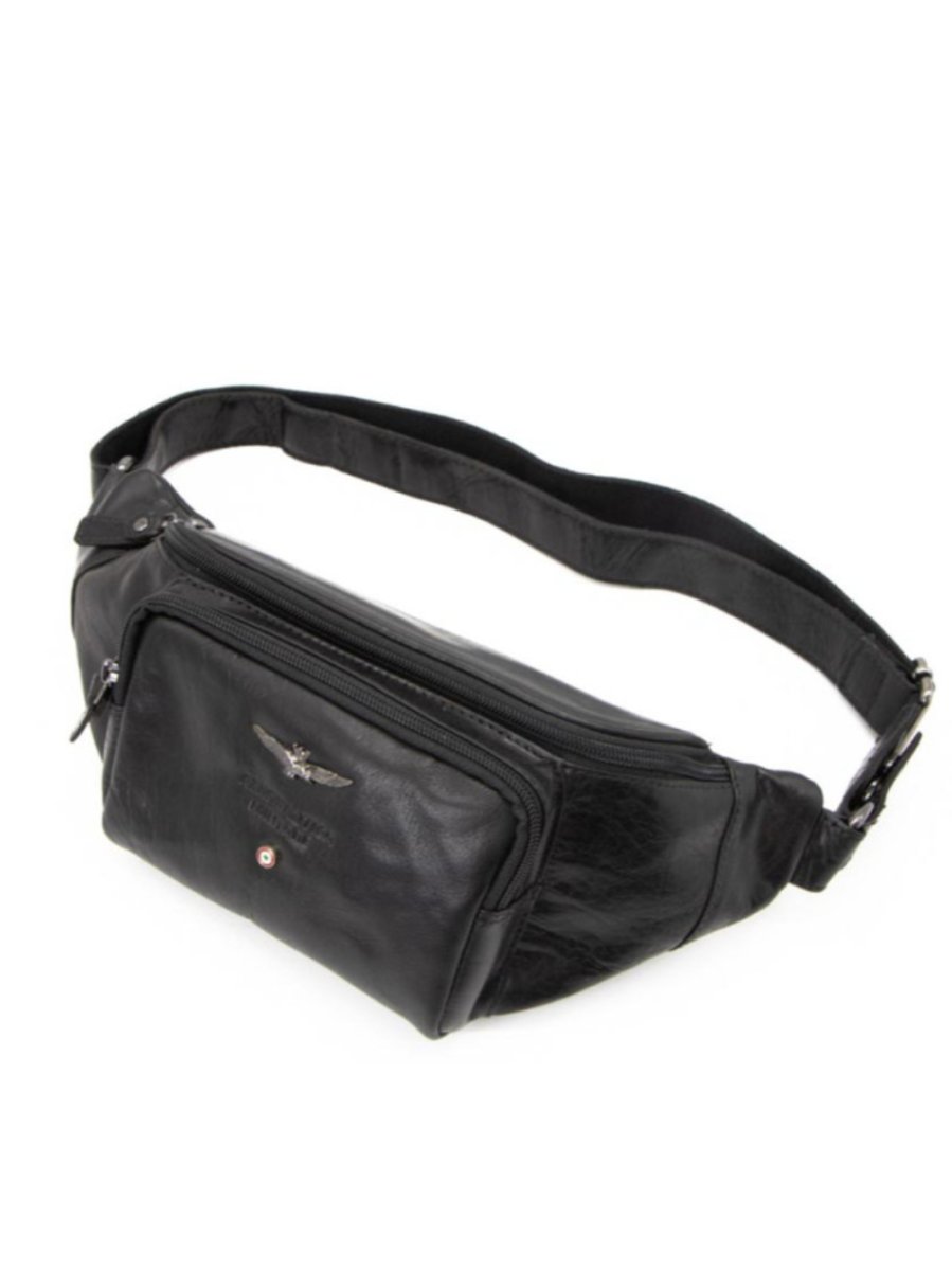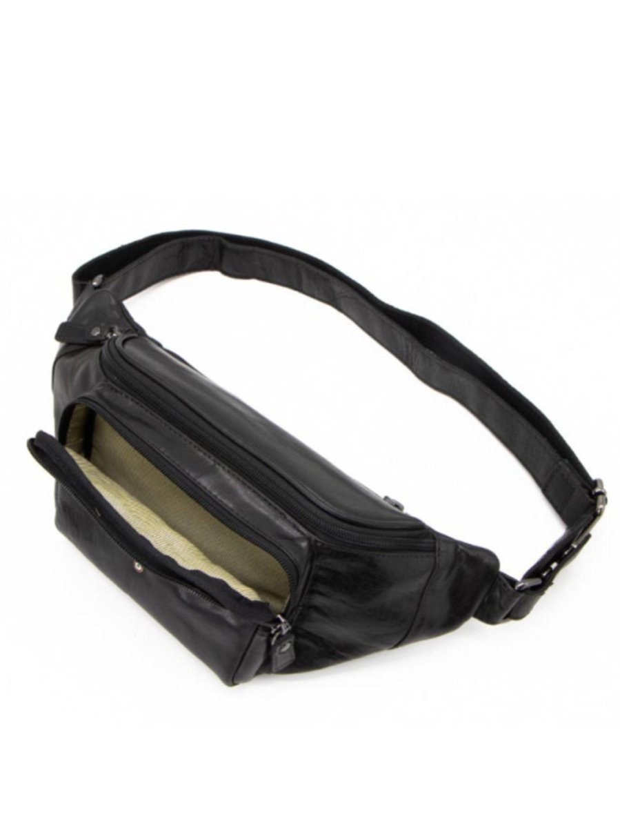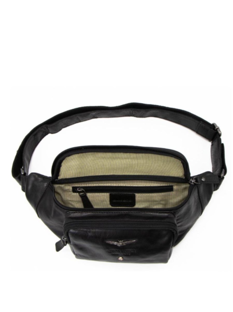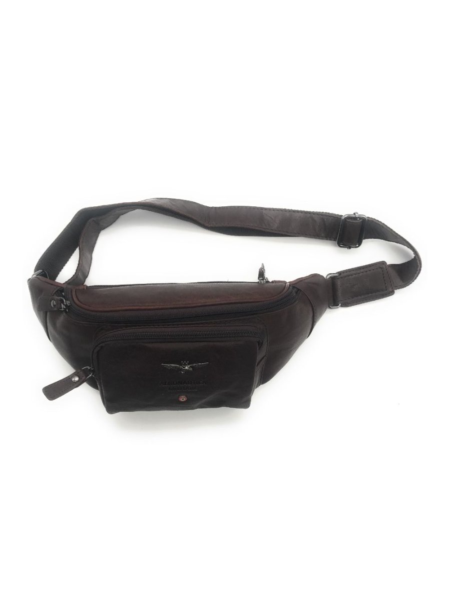 Marsupio in pelle con cinturino regolabile, scomparto principale chiuso con zip e tasceh interne, comoda tesca esterna chiusa con zip.